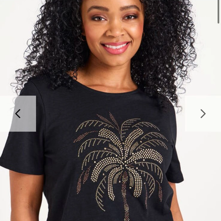 Update your summer styles this season with this gorgeous hotfix palm print t-shirt. It features a classic round neckline along with comfortable short sleeves. Style this t-shirt with short and sandals for a great holiday style.