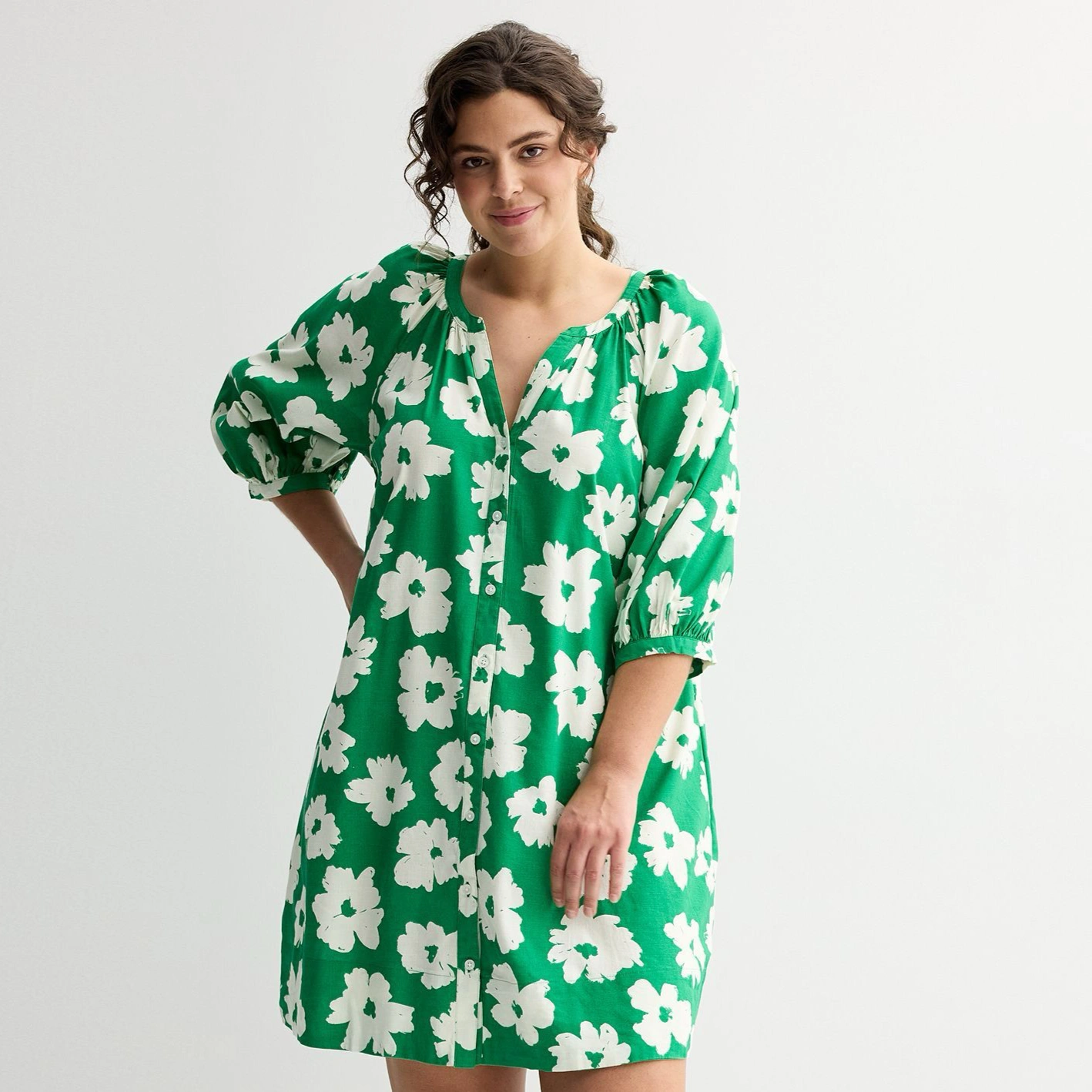 Bright and cheerful, this Green Meadow Floral Button-Front Shirt Dress brings easy, feminine style to your warm-weather wardrobe. Crafted for comfort and movement, the relaxed A-line silhouette skims the body without clinging and hits above the knee for a casual, flirty look. The dress fastens with a discrete row of front buttons beneath a soft V-neckline and has voluminous three-quarter puff sleeves finished with elastic cuffs for a subtle gathered effect. The bold, oversized white blooms pop against the saturated emerald background for a modern, eye-catching print.