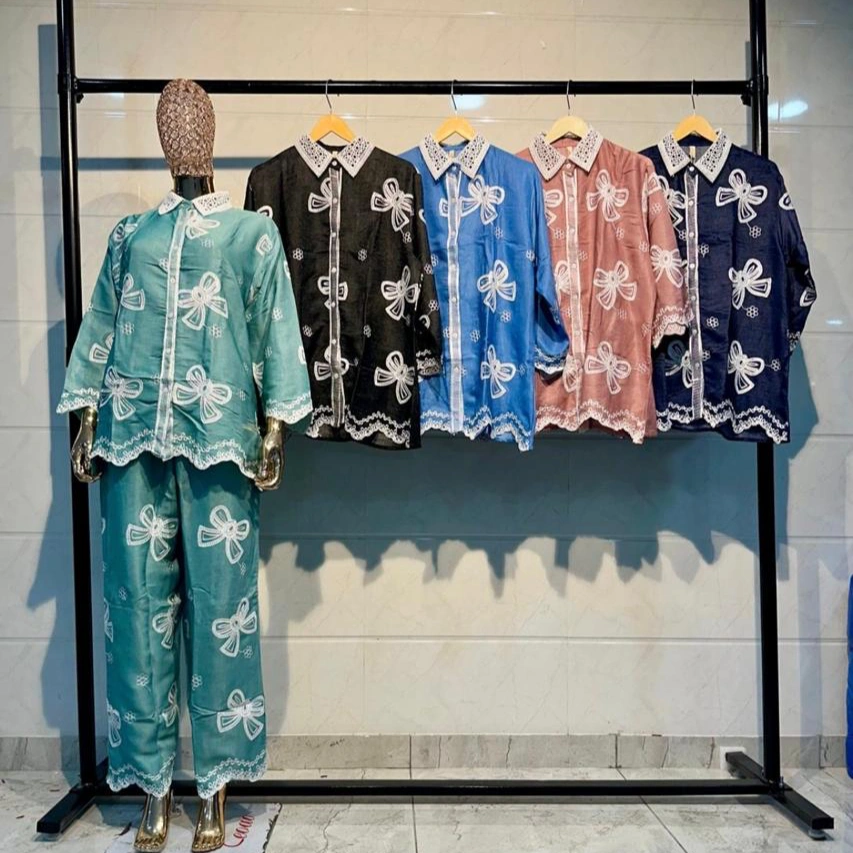 Step into effortless elegance with this beautifully embroidered co-ord set. Designed in a relaxed free size fit, it features a collared button-down top with scalloped lace edges and wide-leg trousers for all-day comfort. The standout detail? Delicate all-over bow embroidery that adds a playful yet chic touch to your look.