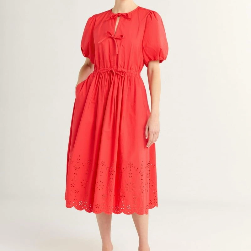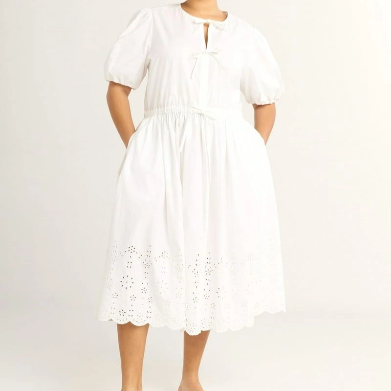 Effortlessly elegant, this midi dress is crafted in a lightweight fabric with delicate chikan-kadhai inspired cutworkalong the scalloped hem. Designed with puff sleeves, a tie-up neckline, and a gathered elastic waist, it blends comfort with feminine charm.