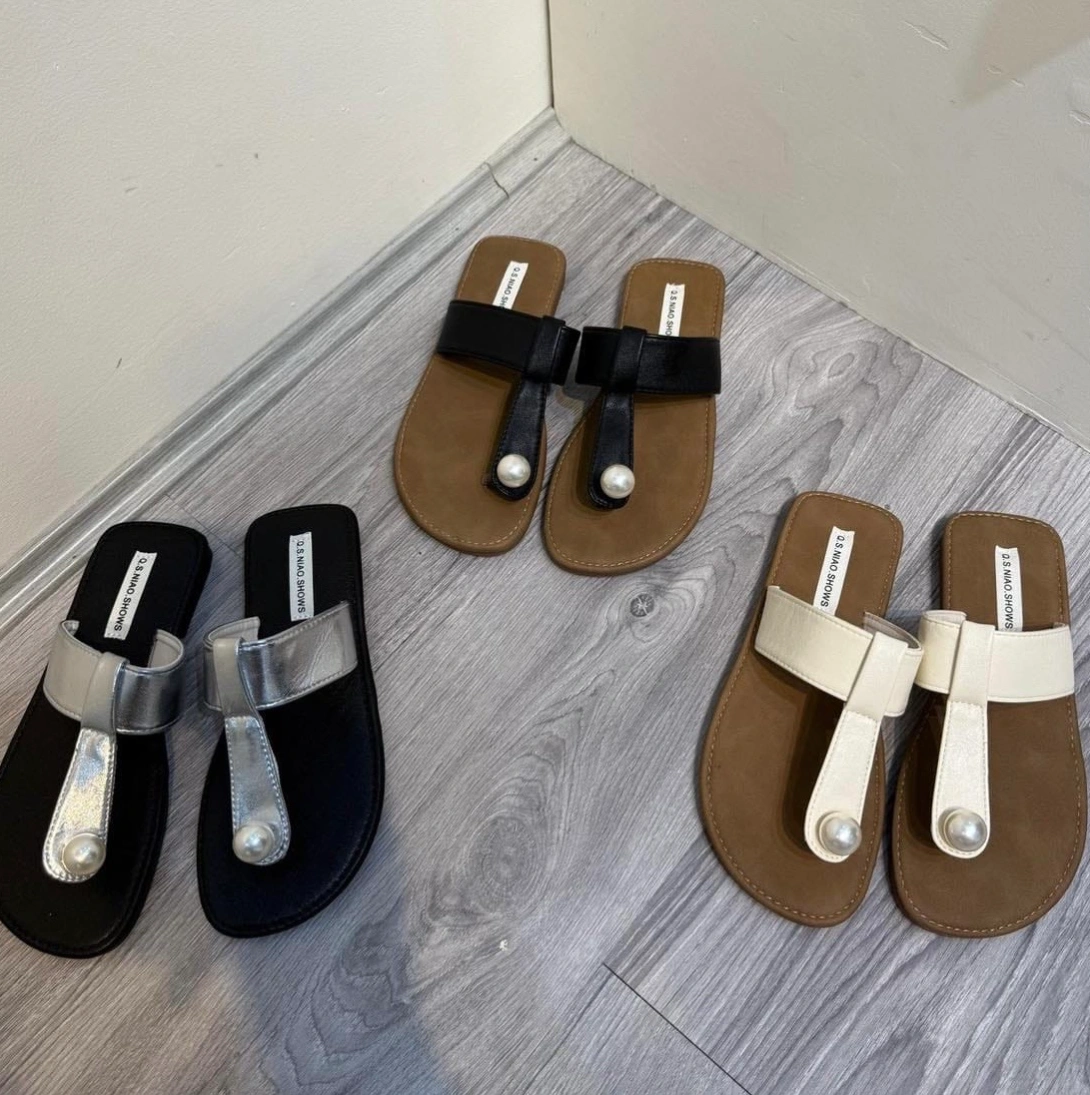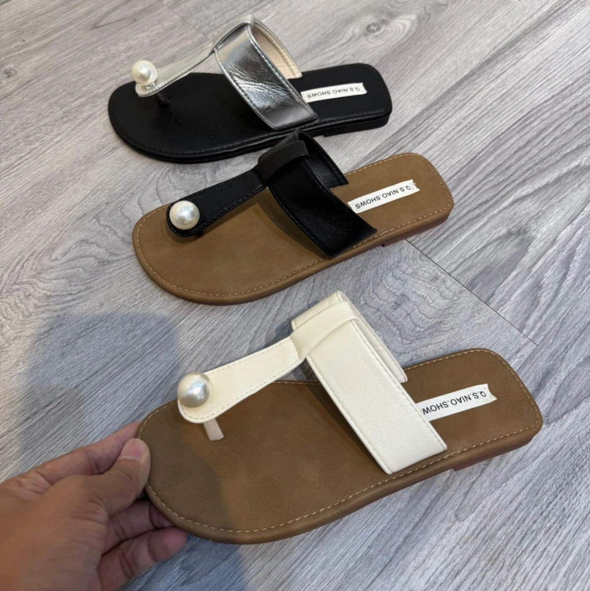 Step into effortless style with these chic slip-on sandals featuring a modern toe-ring design and a statement pearl embellishment. Crafted with a comfortable flat sole and wide straps for a secure fit, these sandals combine elegance with everyday wearability. Available in versatile shades of black, beige, and silver, they pair perfectly with both casual and dressy outfits.